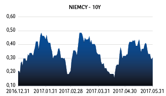 Na rynku 10-letnich obligacji USA doświadczyliśmy spadku rentowności od początku roku (z 2,44% do 2,20%), natomiast na rynku 10-letnich obligacji Niemiec doświadczyliśmy wzrostu rentowności (z 0,21% do 0,30%).